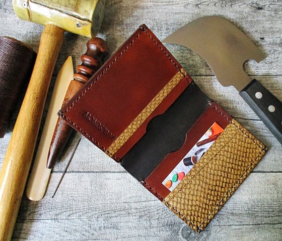 Dieses außergewöhnliche Kartenetui wurde aus dickem Rindsleder geschnitten, von Hand aufwendig in verschiedenen Brauntönen gefärbt und schließlich Stich für Stich von Hand genäht. Zwei Streifen aus naturfarbenem Lachsleder lenken zusätzlich die Blicke auf das Etui. Das Etui hat ein großes Fach für Geldscheine und mehrere Steckfächer für Karten. Es liegt angenehm in der Hand und […]